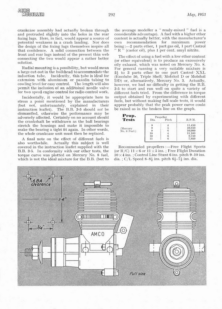 The rival Aeromodeller magazine never got around to testing the AMCO 3.5 BB while it was still being produced by the Anchor Motor Co However, they did publish a Ron Warring test of one of the later examples produced by the successor company, the Aeronautical Electronic & Engineering Co This test appeared in the May 1953 issue of the magazine.