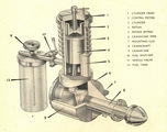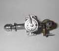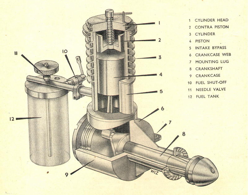 The engine has a number of interesting features which can be seen in the attached photographs. The numbers on both the cylinder head and needle valve grip were intended to allow the user to record the best settings for starting and running. The compression stop pin could be set in any one of four positions once the correct setting had been found. The cut-out is unusual. It features a spring-loaded plunger which effectively blocks the intake tube on the engine side of the fuel jet, thus starving the engine of mixture as opposed to merely cutting off the fuel supply to the jet. The photos show it in the "stop" position. When the arm is pulled out and the lever turned at 90 degrees to rest on the outer end of the cut-out mounting, the intake is clear. When the timer pulls the lever into the visible slot, the plunger snaps home and stops the engine. Quite effective!