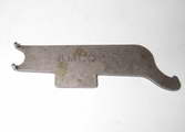 Each engine was supplied with a special combination tool. This example still has that tool with it, although the box is long gone. The twin prongs at the left end align with two of the holes on the cylinder head to remove it if required. The rectangular "bump" in the middle fits the backplate cavity perfectly and keeps the tool centered when it's being used to shift the backplate. The C-wrench at the right end does not hook into an exhaust port—it hooks into a small cut-away on the lower cylinder flange—the one which sits directly on top of the case. This cut-away may be hard to see in the photos—it's directly beneath the intake at the rear of the flange. Its sole purpose is to allow this C-wrench to tighten or remove the cylinder.