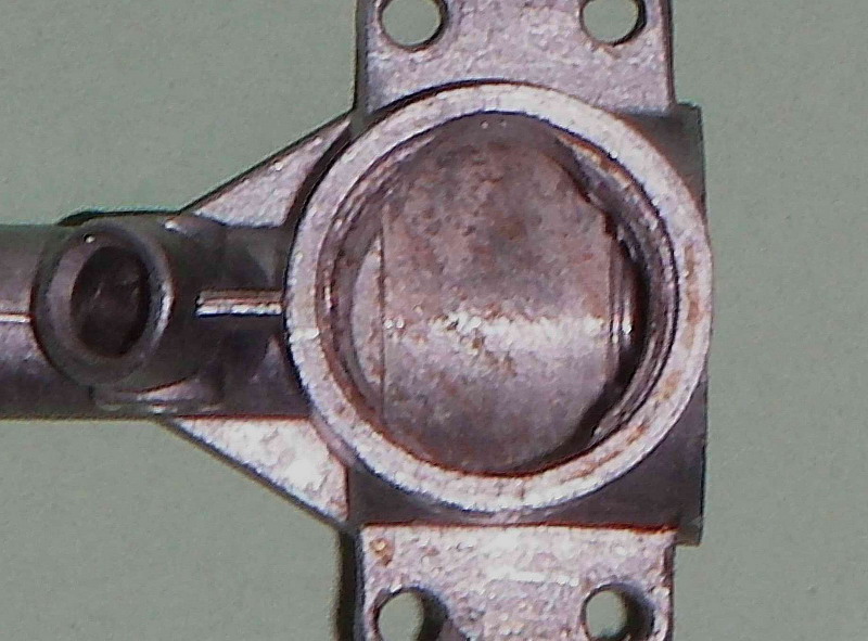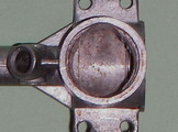 I also added two short flow channels radiating from the central gas passage at 90 degrees to each other in the rear face of the crank disc to help gas to escape from the shaft interior during the period around bottom dead centre when it's largely blocked by the con-rod while transfer of gas is still taking place. These were symmetrically arranged on the opposite side of the gas passage from the crankpin so that at bottom dead centre they fed upwards at 45 degrees, one to each side of the rod. Finally, I ground a little metal off the rim of the crank disc on both sides near the crankpin (taking great care not to damage the pin!) to add some counterbalance. Probably not strictly necessary with an engine of this displacement, but every little bit helps!