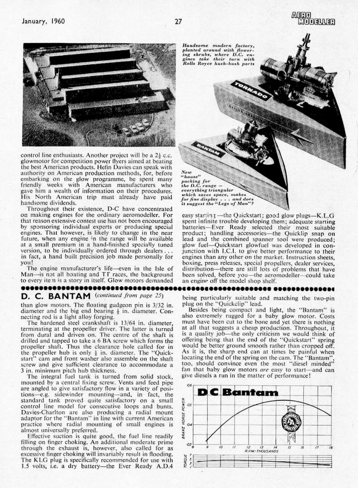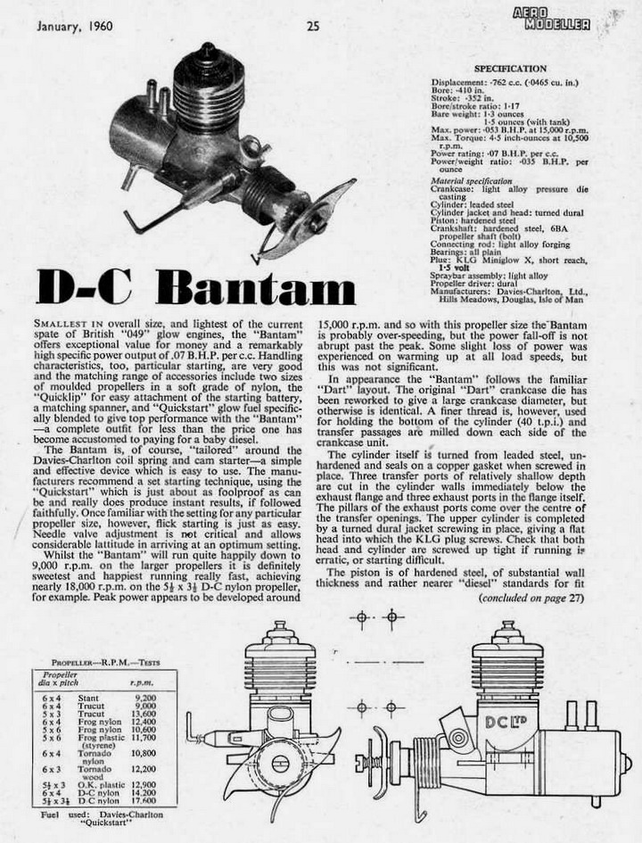 The D-C Bantam was a popular 0.76 cc glow-plug motor manufactured by Davies-Charlton Ltd on the Isle of Man between late 1959 and 1971. At the time of its introduction it was highly touted as the British response to the challenge of the American-made 1/2A glows which were then reaching Britain in ever-increasing numbers. Would that the response had been a little more vigorous.