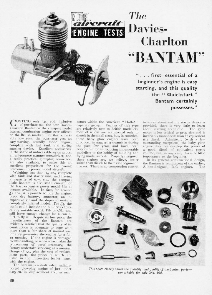 Although the beginners and sport fliers who undoubtedly made up the majority of Bantam owners probably neither noticed nor cared, the sense of let-down among the more serious and experienced modellers was quite palpable at the time, and the Bantam probably did more to turn the tide of prejudice against British .049 glows among serious modellers in Britain than any other engine. It also didn't do any favors to Davies-Charlton's reputation among the cognoscenti.