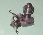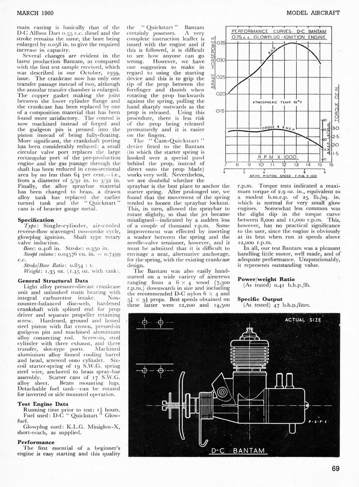 The bare weight was a very light 1.3 ounces, or 1.5 ounces with tank. Some of this was accounted for by the fact that the Bantam was equipped with Davies-Charlton's Quickstart spring starting device. If ever there was an engine that didn't need this silly piece of equipment, it was the Bantam! The engine was so docile and so easy to flip over that the use of a starter of any kind was quite unnecessary and merely added bulk, dead weight, cost and complexity for no benefit. Most users removed this clobber right away.