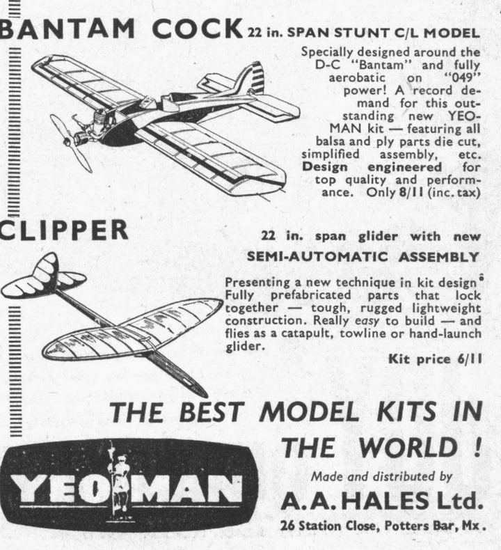 A few kit manufacturers got onto the Bantam bandwagon by releasing kits specifically tailored to the Bantam. Notable among these was AA Hales, who released the Bantam Cock stunt control-liner in early 1960 under their in-house "Yeoman" brand. I must confess to having built a Bantam Cock for my own Bantam using a borrowed plan (couldn't afford the kit—sorry, Yeoman). It got the very light model into the air, but was pretty marginal for aerobatic performance.
