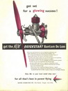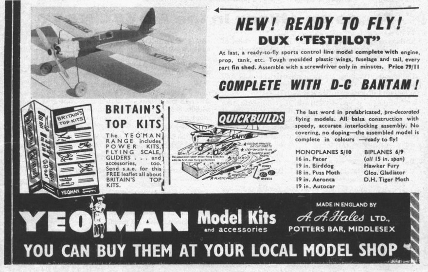 The fact that the more serious modellers pretty much ignored the Bantam probably didn’t bother Davies-Charlton at all! Those types were far outnumbered by the beginner and sport-flying crowd, and these individuals evidently had no complaints about the engine. AA Hales didn’t give up on the Bantam either—they actually marketed a German-made Bantam-powered plastic RTF control-line model called the Dux Testpilot in time for Christmas 1960 ("...every part fin shed"