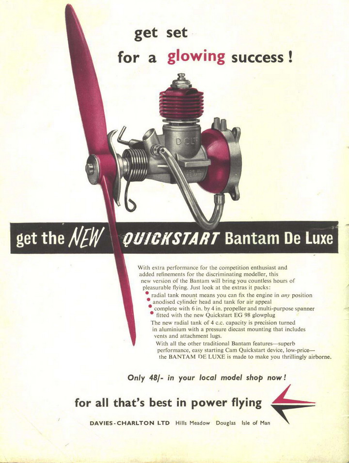 At the time of the Bantam's release, I was an impecunious twelve year old schoolboy living in Sheffield, England and flying smaller models simply because I could more or less afford to keep them supplied with fuel! As of early 1960 I had an ED Bee (who didn't?!), a beat-up Frog 80 Mk I and a ratty but still very serviceable Allbon Merlin. I was happy with these little diesels, but nonetheless wanted to try a glow. I didn't like the radial mounts and bulky back tanks on the then-current Cox .049 models, so when a rash of beam-mounted British 1/2A glow models started appearing in mid 1959, I sat up and took notice.
