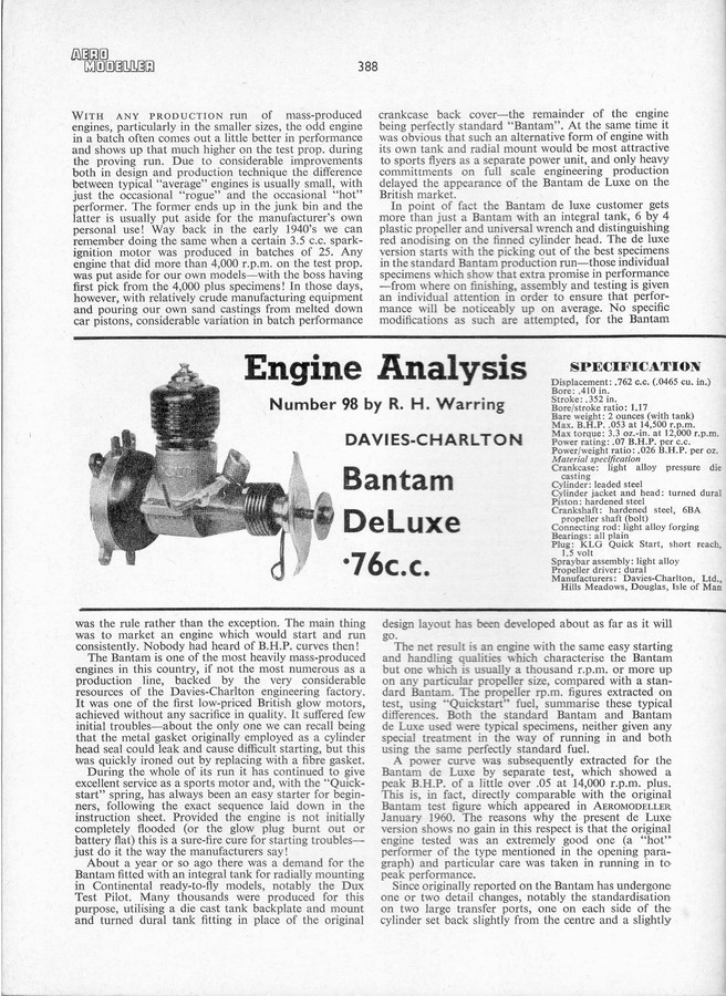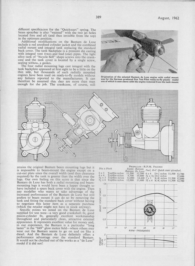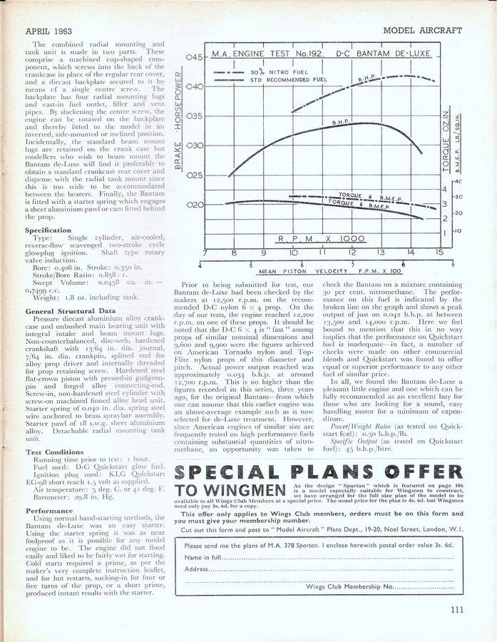Unfortunately for Warring, Peter Chinn once again upset the apple-cart by publishing his own test of the Bantam Deluxe in the April 1963 issue of Model Aircraft (calling it a "diesel motor" in the heading—oops!) Chinn repeated the manufacturer’s line about the Deluxe model being a high-graded standard Bantam, but confirmed that the design of the engine was identical to that of the standard model. He then proceeded to throw cold water on the high-grading concept by finding an almost identical performance to that which he had obtained in 1960 for the standard Bantam. He recorded a peak output of 0.034 BHP at 12,700 rpm on Quickstart fuel—virtually a repeat of his woeful 1960 figures. Perhaps in desperation, he did on this occasion try the engine on a fuel containing 30% nitro, finding an improvement to 0.042 BHP at around 13,800 rpm. These of course are still well short of Warring’s figures.