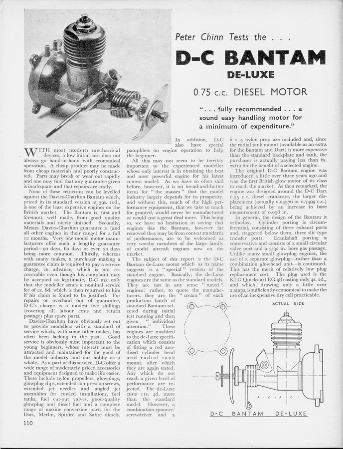 It was in fact very "convenient" for Davies-Charlton that Warring's report made it into print two months prior to Chinn's far more representative analysis. Warring's extremely positive test report was received with great enthusiasm, and everyone immediately rushed out to buy a Bantam, however the more discriminating buyers soon became aware of the fact that examples as good as the one that Warring tested appeared to be scarcer than sealions in the Sahara! Most of those that found their way into the hands of modellers (and there were a lot of them) quickly proved themselves to be gutless wonders, albeit very light, compact, easy starting and well made. There was much puzzlement; I remember it well!
