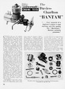 The widely-heralded introduction of the Bantam attracted a great deal of modeller interest, and Aeromodeller magazine hastened to scoop the review of the new engine. They did so in the most emphatic manner by putting it up against two competing British .049 glow-plug motors from Allen-Mercury and Frog in an unusual triple engine test. It received a glowing accolade from tester Ron Warring in his January 1960 report.