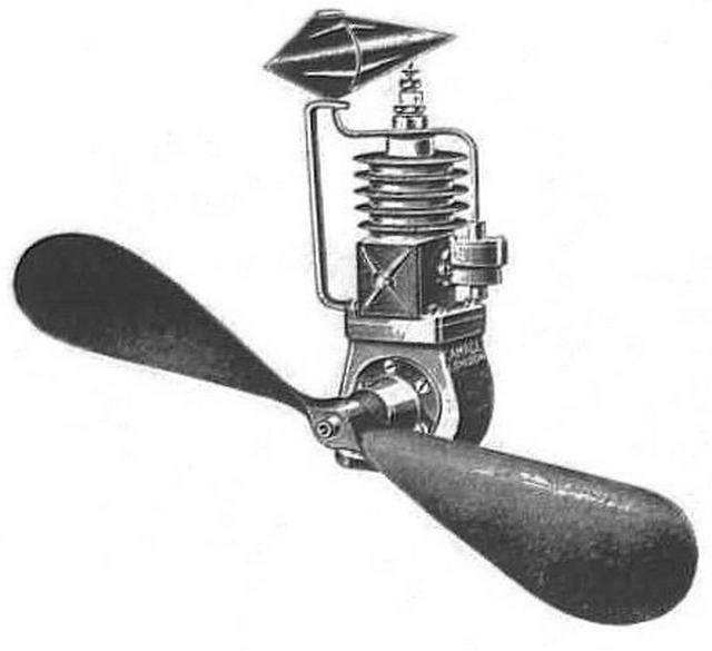 Although the British modeller David Stanger reportedly sold a few four-stroke multi-cylinder powerplants beginning in 1907, the first evidence of which I am aware for the commencement of anything approaching the mainstream commercial marketing of model engines appeared in the 1909 catalogue of the famous London firm of Gamages. This catalogue listed a 25cc single-cylinder 2-stroke engine that was recognizably a direct predecessor of the model engines that were to follow in subsequent decades. The reported weight of the engine was 36 ounces including the gravity-feed tank and the trembler coil for the ignition system. The attached illustration from Gamages' 1909 catalogue implies that the carburettor was probably of the early wick-feed type. Oddly, there is no evidence of any form of ignition timing arrangement in the illustration, but the fact that a trembler coil was supplied clearly implies the use of the relatively primitive jump-spark ignition system with its inherent tendency towards misfiring at higher speeds.