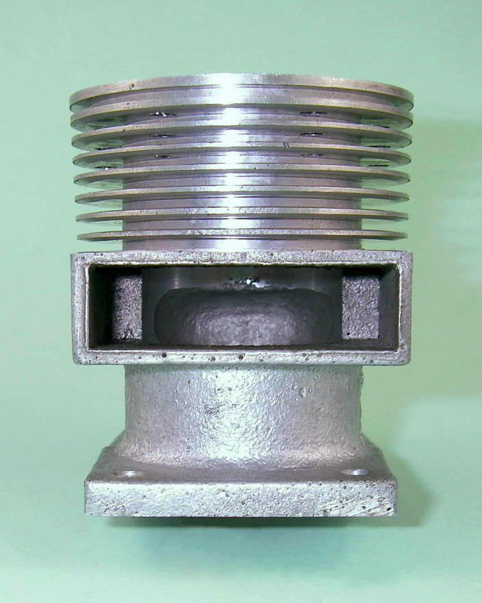 The construction of the engine was a little unusual in that the main casting terminated vertically in a flange just above the mounting lugs, with the cylinder liner being retained in a separate casting which incorporated the exhaust stack and cooling jacket. This assembly was attached to the main crankcase with four screws passing through the corners of a matching flange below the level of the exhaust stack. The configuration had the advantage of allowing for servicing of the piston, rod and rings without the need to disturb a good head seal. It also greatly facilitated the fine-tuning of the cylinder port timing, since that timing could readily be adjusted without disturbing the liner simply by inserting shims of varying thicknesses between the cylinder base and the upper crankcase. The head could of course also be re-shimmed as required. The rear disc rotary valve was carried in a separate casting which aligned with a vertical central split in the crankcase across its axis and thus formed the rear half of the crankcase.