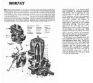 "The post-war model of the Hornet, which may be described as an engine in the high-priced class designed for high power output, is now in production. It is a Class C engine with a bore of 15/16" and a stroke of 7/8 in., giving a piston displacement of .604 cuin Two ball bearings support the crankshaft. Material specifications include 356T6 aluminium alloy for the cylinder, crankcase and rotary valve, 14T2 aluminium alloy for the cylinder head, which is attached to the cylinder with 6 screws, and 142T571 aluminium alloy for the piston. The connecting rod is forged from 14S dural and provided with bronze crankpin and wrist pin bearings. There are three intake openings and six exhaust openings in the cylinder, which is attached to the crankcase with 4 screws. A Meehanite iron cylinder liner is provided.