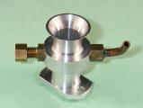 The original carburettor depicted in the early advertisements was modeled very closely upon that used on the A. C. Special. However, this was soon changed to a far more interesting design originated by Hornet Motors. When one is first confronted with one of these engines, one is forced to wonder how the screw-in venturi unit is installed given the fact that the rectangular block into which the needle valve components are threaded is sufficiently large to foul the central boss for the rear disc mounting and thus prevent rotation of the venturi. The answer is that the brass venturi is actually made in two parts. The screw-in section is a simple tube with a slightly reduced external diameter at the rear which creates a shallow shoulder just forward of the needle valve location. This shoulder serves to locate the second component, which incorporates both the bell-mouth intake and the needle valve installation block. This component slips over the reduced diameter of the rear end of the screw-in section to butt up against the shoulder. The threaded holes for the needle valve spigots pass through both components, the result being that once the needle valve assembly is installed, the two components are locked together.