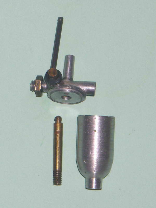 The outside diameter of the intake tube on this variant was parallel for its entire length, there being no bell-mouth at the intake. The fuel tank was of metal, and was mounted by screwing onto the full-depth brass fuel delivery pipe. This pipe in turn screwed at its upper end into the main venturi casting and incorporated the very fine fuel jet which protruded into the venturi throat. A rather inconvenient feature was the fact that only a single tiny hole was provided as a vent for the fuel tank. The tank could only be filled through this hole by the use of a needle syringe, and if this was not available the only recourse was the removal of the tank for filling.