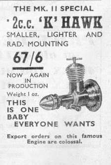 The Mk I Series III version of the sideport Hawk seems to have survived in production for some time following the take-over by the "K" Model Engineering Co However, the engine had disappeared from the company's advertising by April of 1949 and in May 1949 we find the company announcing a completely revised Mk II model of the Hawk which used radial mounting in conjunction with front rotary valve (FRV) induction.
