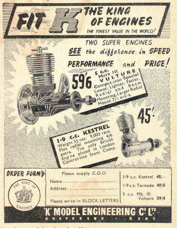 The emerging picture here is one of a company struggling and failing to maintain its position in the marketplace in the face of a negative perception resulting from the failure of several of its offerings to live up to their billing. The final Aeromodeller advertisement to be placed by the "K" Model Engineering Co appeared in the November 1950 issue at which time the price of the Mk III Vulture had been dropped from its former £4 15s 0d to a mere £2 19s 6d. This is about as clear an indication as one could wish that the company had ceased production and was simply liquidating its assets by this time.