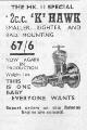 The Hawk Mk II appears to have been fairly quickly supplemented by a further variant known as the Hawk Mk II "Special", which first appeared in a June 1949 advertisement placed by the "K" Model Engineering Co This retained the FRV induction of the original Mk II and apparently used the same cylinder design. However, it employed a revised crankcase casting which featured an Arden-style tankless radial mount and updraft intake located beneath the main bearing to feed the crankshaft rotary valve. Overall, it displayed strong influences from the contemporary 1.96 cc K Falcon and other K designs as well as the radial-mount Elfins.
