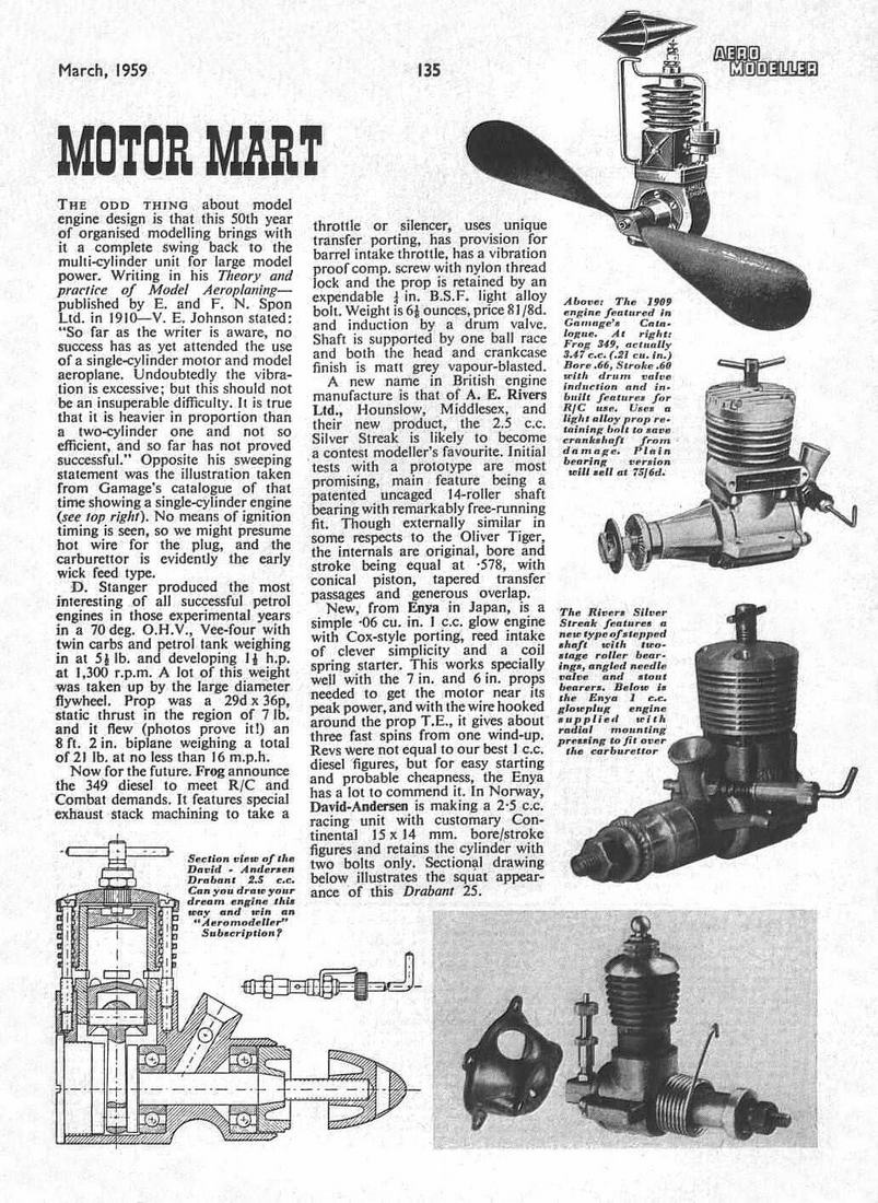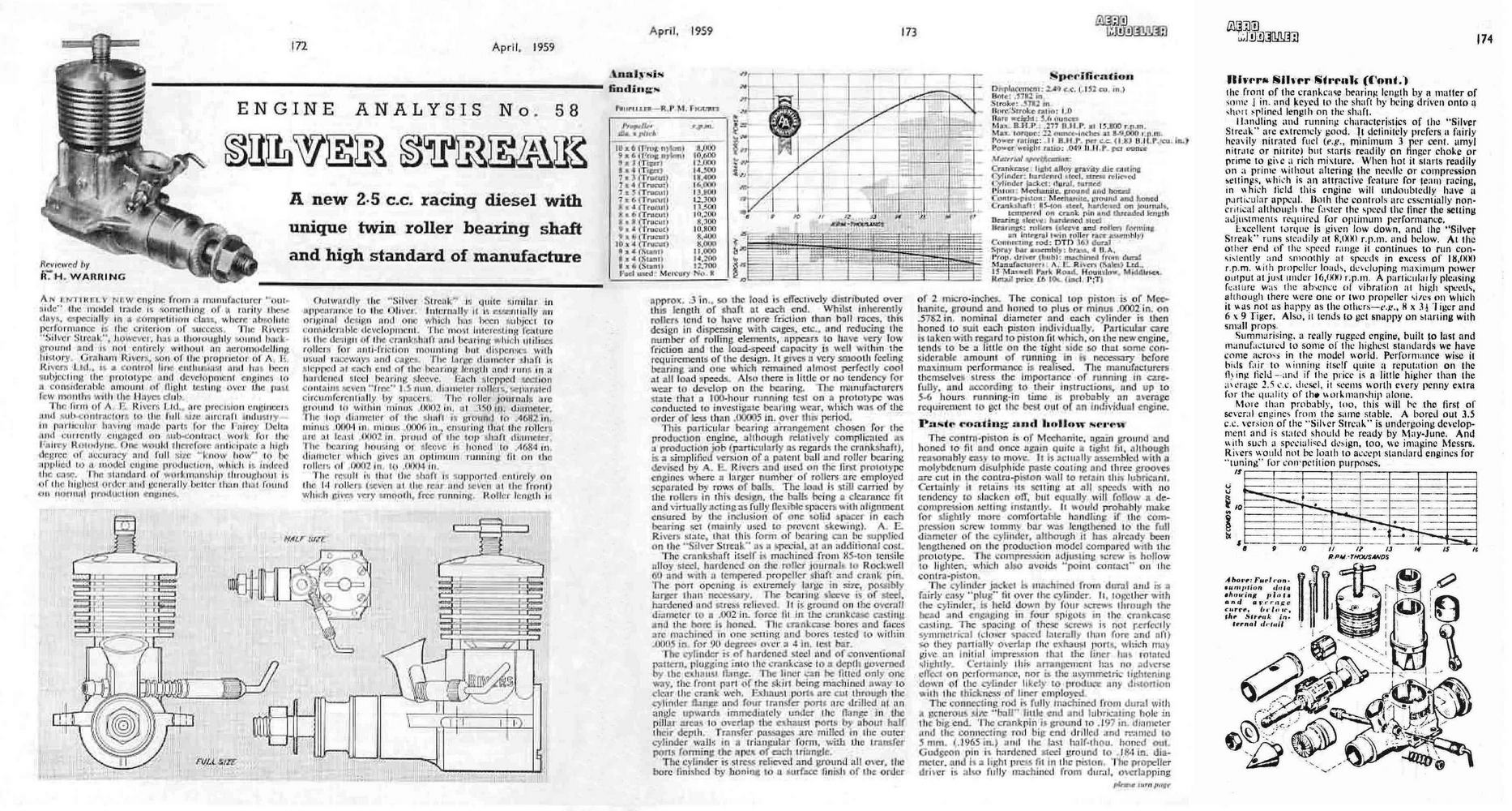 The first published test of the Rivers Silver Streak Mk I appeared in the April 1959 issue of Aeromodeller magazine, the tester being Ron Warring. Allowing for editorial lead-time, this implies that Warring had been unusually quick to get his hands on the test engine. The Silver Streak had of course been featured in the previous month's "Motor Mart" column, but even so this was a remarkably quick reaction to the engine's appearance.