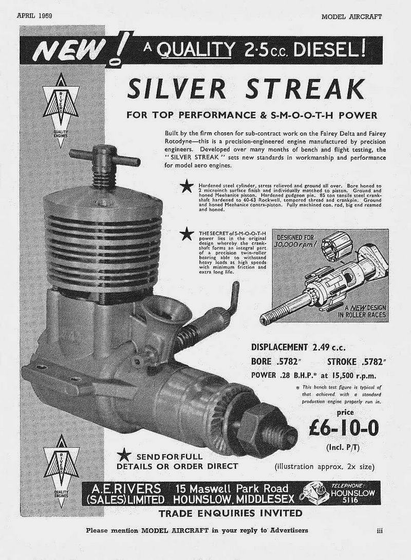 As far as I'm aware, the introductory announcement of the Rivers Silver Streak appeared in the "Motor Mart" feature of the March 1959 issue of Aeromodeller magazine. This was accompanied by the appearance of full-page advertisements in the major British aeromodelling magazines. These initial advertisements cited the manufacturer's previous experience in the aviation industry and went on to extol the virtues of the unique roller bearing crankshaft design. The stated selling price of the engine was a healthy £6 10s 0d (£6.50 in modern money)—a very high figure for an over-the-counter 2.5cc diesel in the context of the contemporary British market. Trade inquiries were invited—seemingly the company was still in the process of establishing its distribution network at this time.