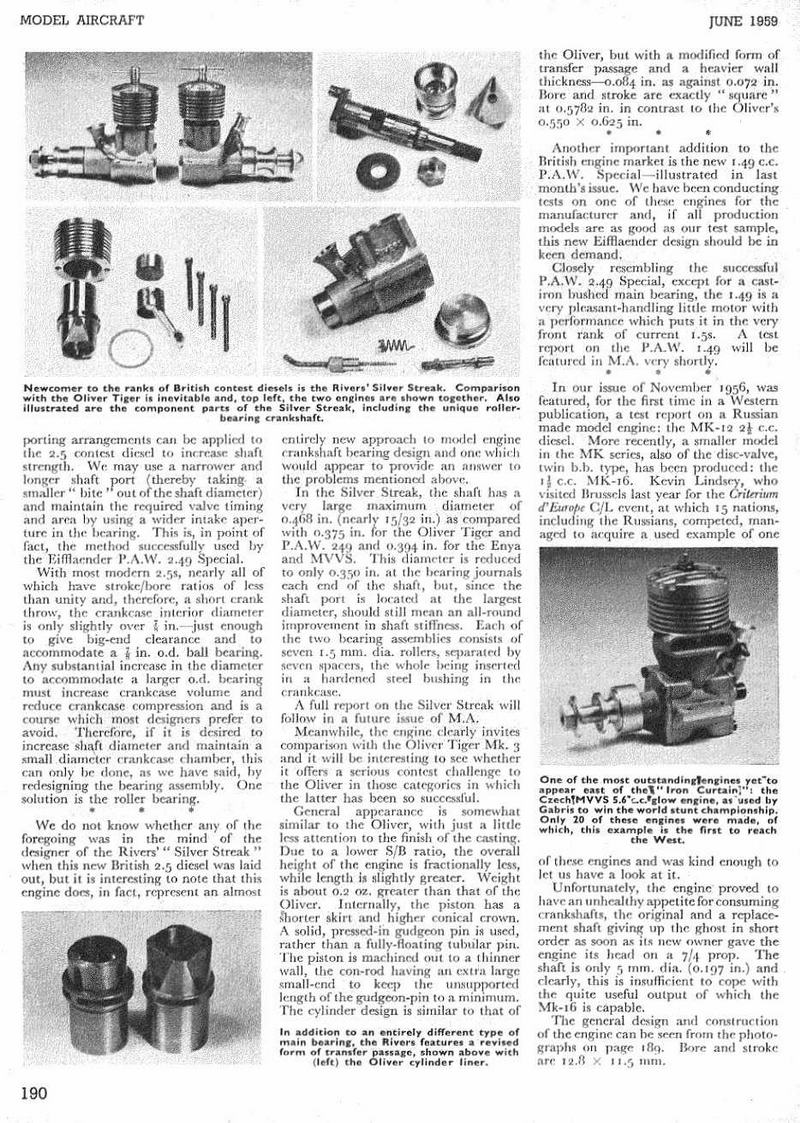 Unaccountably, Model Aircraft tester Peter Chinn was quite a bit slower off the mark in getting to grips with the Silver Streak. Chinn first noted the appearance of the engine in passing as a footnote to his "Latest Engine News" column in the May 1959 issue of Model Aircraft, going on to discuss the engine in more detail in his June 1959 column in the same magazine. However, it was not until the November 1959 issue of the magazine that his test of the engine finally appeared.