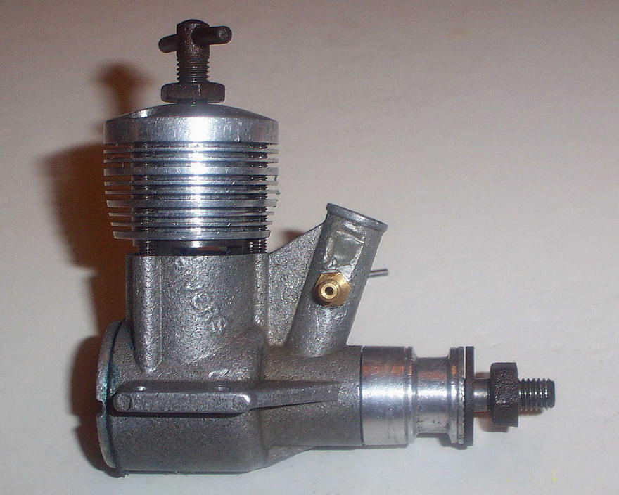 The crankshaft design followed that of the smaller engine, the same uncaged needle roller bearing system being employed. According to Peter Chinn's description in his February 1960 test of this model (see below), the shaft was essentially the same as that used in the Silver Streak apart from the increased throw. Chinn also noted that the internal gas passage and induction port were both enlarged to accommodate the larger engine's increased appetite for fuel mixture. This may have led to reliability problems, as we shall see. The engine featured the same externally-threaded extension at the front of the shaft for prop mounting purposes. As with the Silver Streak, buyers could order the engine with either a conventional prop nut or a neat aluminium alloy spinner nut.