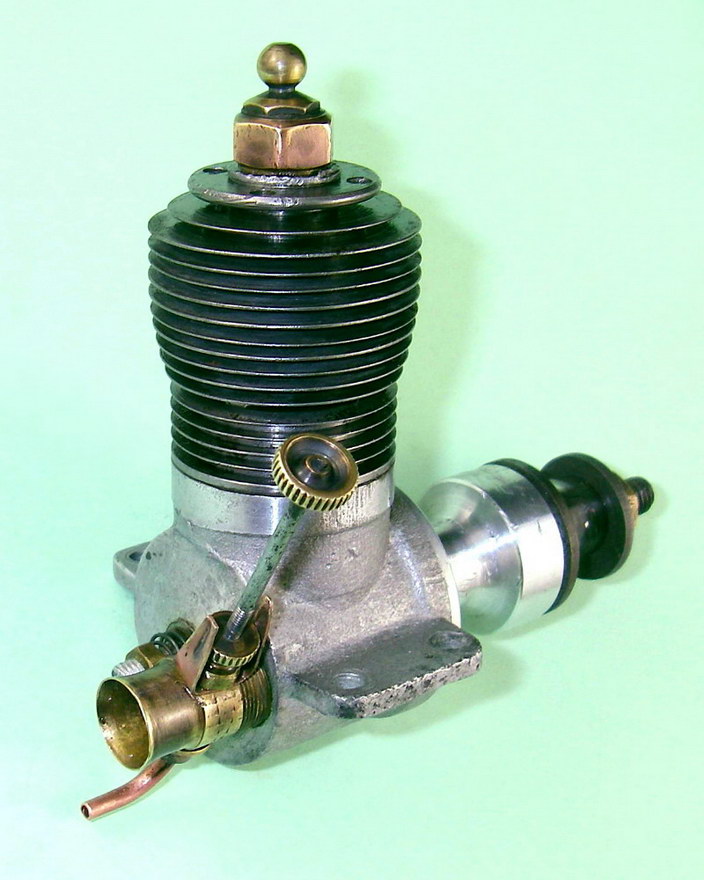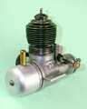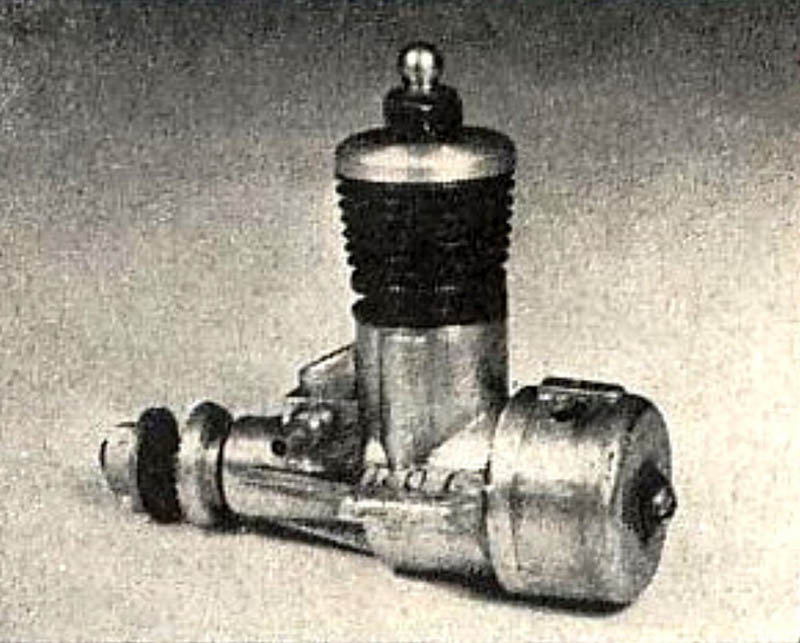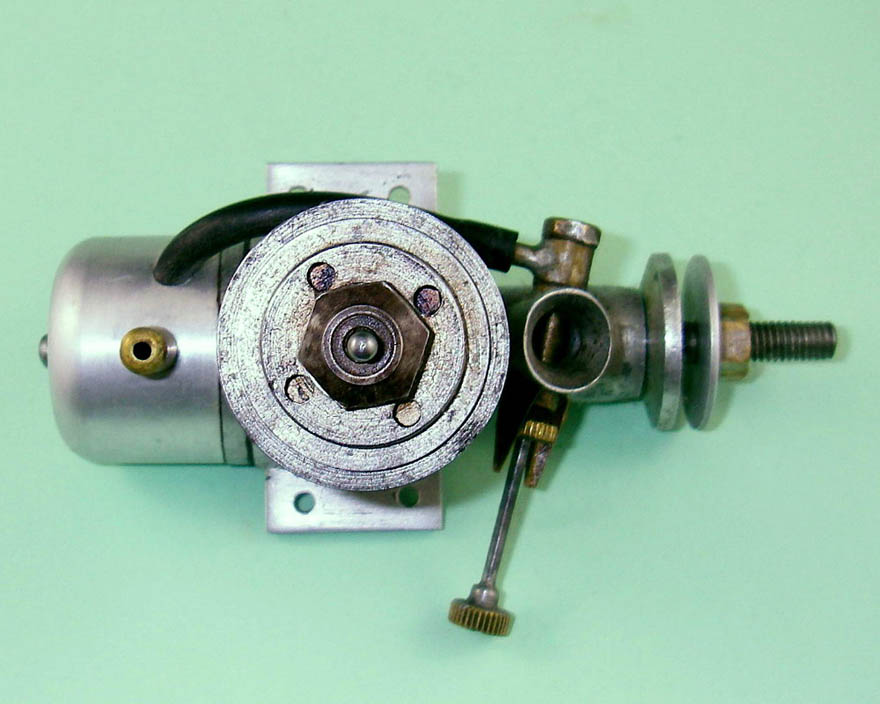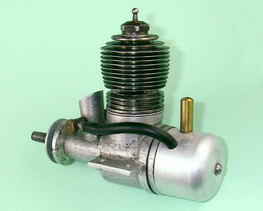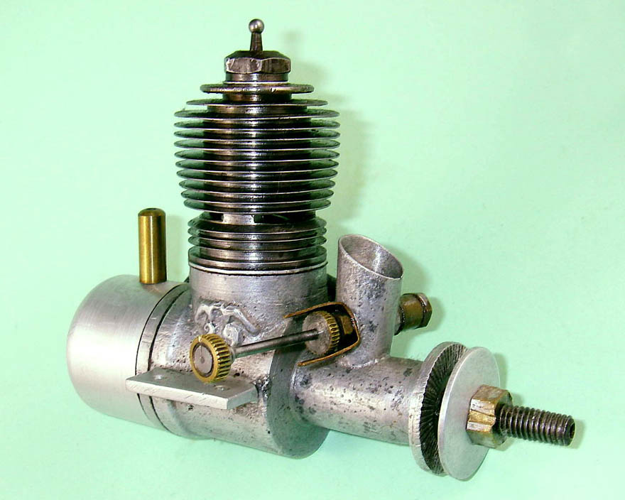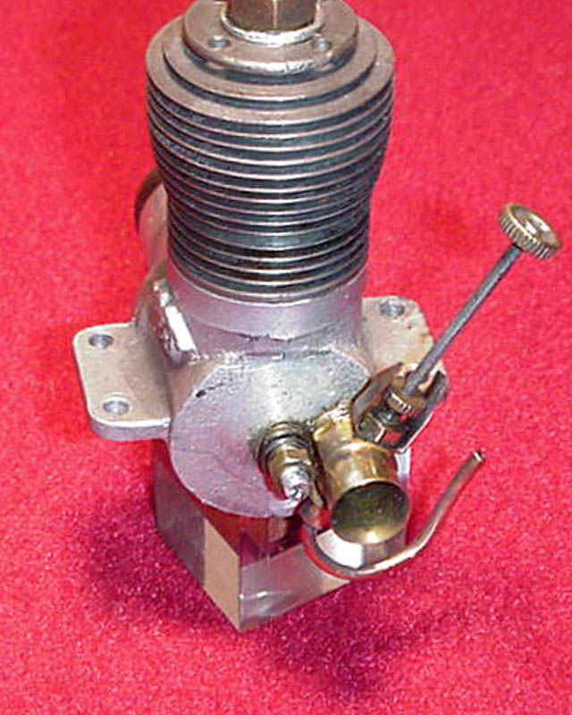 The engine which forms the subject of this article is a very simple and lightweight 4.96 cc (.303 cu. in.) crankshaft front rotary valve (FRV) radially-ported glow-plug motor having a number of distinctive features. For one thing, it has a steel cylinder having a blind bore allied to thin integrally-machined cooling fins. For another, it sports a 3/8-24 glow-plug, a fitting which was abandoned fairly early on in the glow-plug era in favour of the familiar 1/4-32 item.