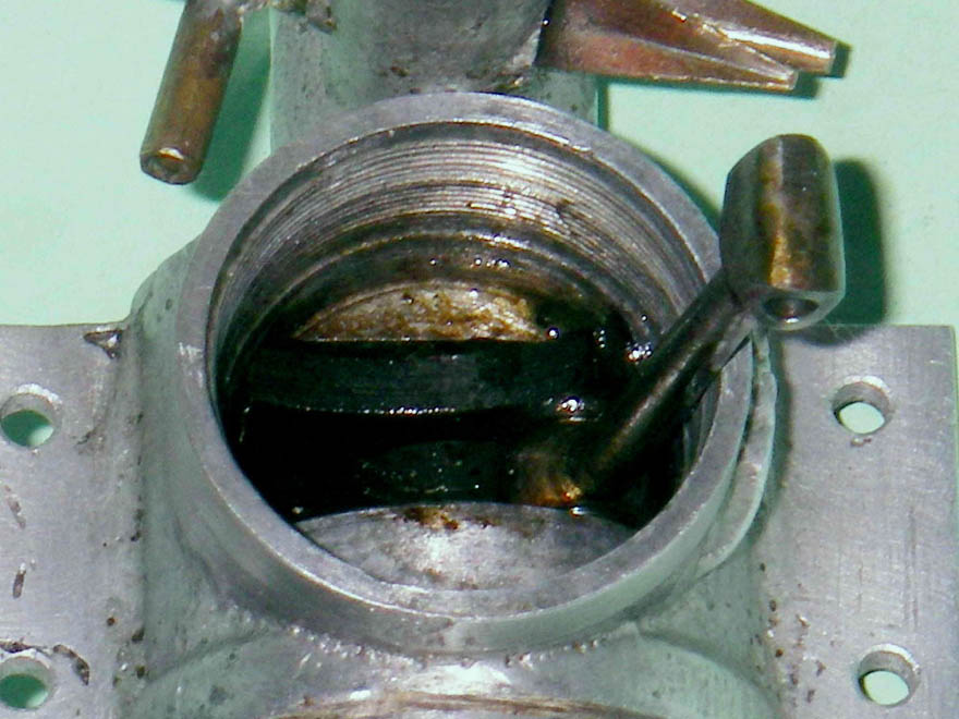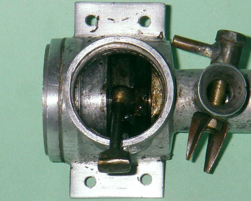 It was possible to determine that the internal gas passage in the crankshaft has a diameter of 7 mm in conjunction with a main journal diameter of 10 mm. A look down the intake venturi tube reveals that the induction port in the crankshaft is of the rectangular variety, which tends to promote more rapid opening and closing of the induction system. The throat diameter of the venturi tube is 6.5 mm.