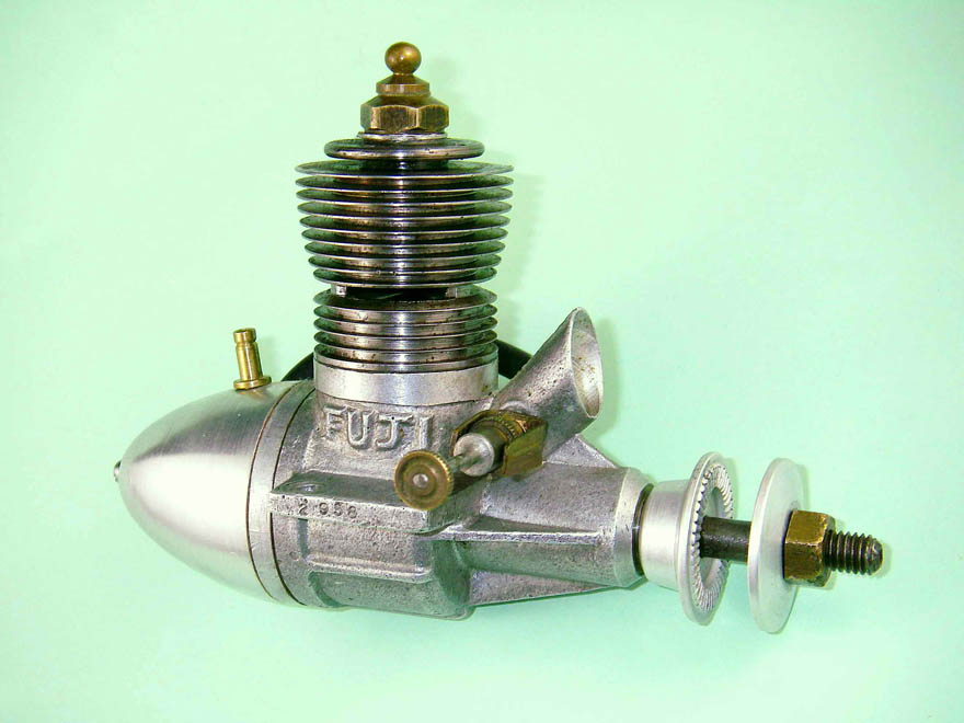 By late 1948 or early 1949 our unknown maker had come up with the subject engine as we now see it and had begun to make it in small quantities, perhaps working more or less alone. Meanwhile, the founder(s) of the Fuji range (which we have covered in a separate series of articles) were getting set to enter the field themselves in early 1949. They took a look at the subject engine and liked its general style. They either persuaded the designer to come on board and help them produce an improved version under the Fuji banner with revised transfer porting and such, or they simply copied certain elements of the overall architecture while adding their own engineering modifications. Certainly, the Fuji is a more sophisticated production than the unknown model, so this fits ...