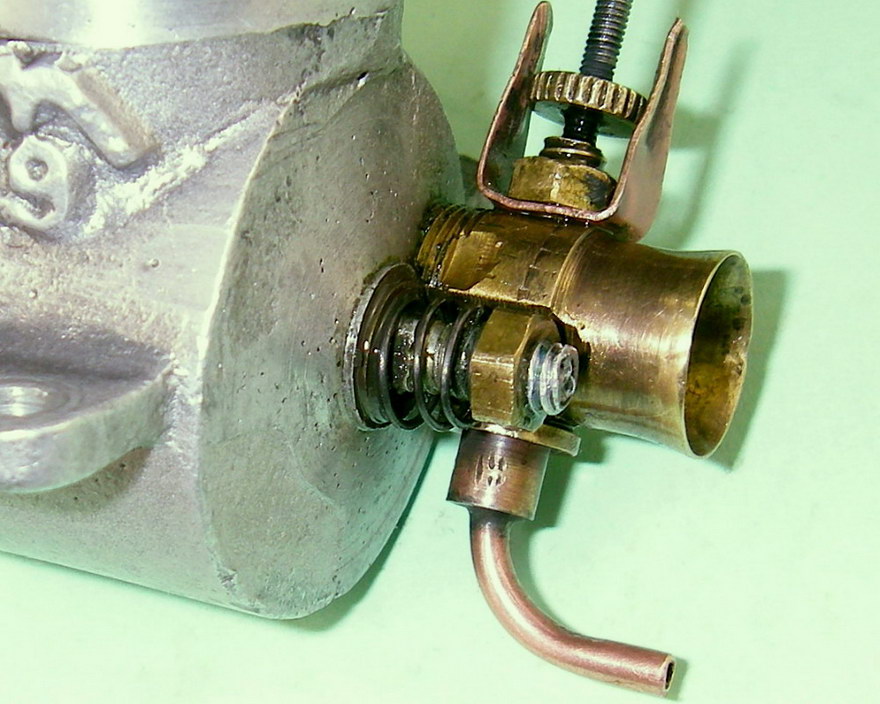 The spraybar (which appears to be original) is a relatively substantial item having an external diameter of 3.5 mm which is externally threaded at both ends as well as being internally threaded for the needle. At the fuel delivery end, a banjo union is secured by a nut to provide a right-angle connection for the fuel line. At the needle end, a two-leaf bronze spring clip for needle tension is secured by a nut. The needle itself is externally threaded M2x0.4. It has both a serrated disc which engages with the spring clip for tension and a control knob at the outer end.