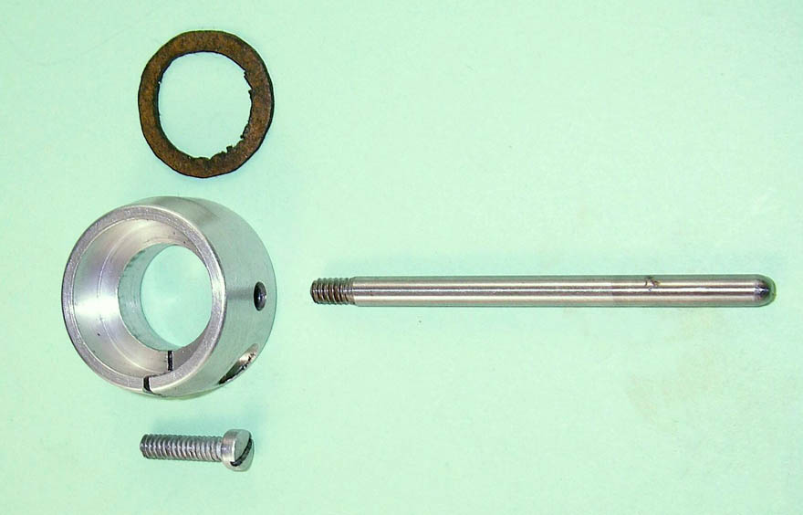 Naturally, I have no idea what the original might have looked like. I made a functional unit which looked far more in keeping with the rest of the engine and also worked in the correct manner. My system employs a turned clamp which grips the protruding portion of the main bearing bushing using a 4-40 screw for tension. The rear of the clamp is recessed to slip loosely over the unmachined main bearing housing. A thick fibre washer is located at the internal step formed by the creation of this recess. This fibre washer bears against the front of the main bearing housing, acting in effect as a "brake pad" to keep the bushing in its set orientation while still allowing compression adjustment during operation. I angled the screw-in steel control arm back at ten degrees to keep the tip well clear of the prop