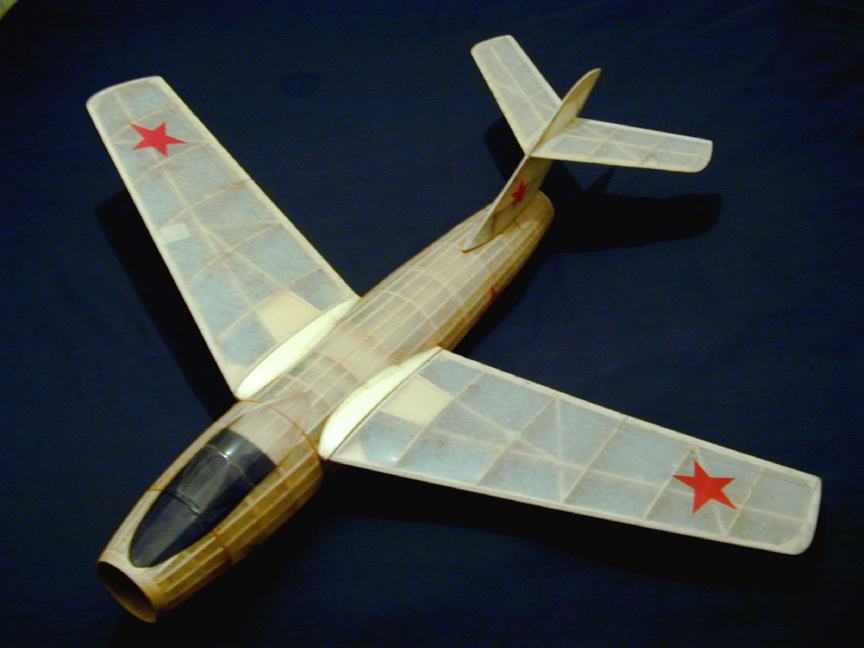 Alas, for me, the Gallah Week-End was a Wash-Out (though I now hear others braved the downpours). Philosophically I could say we needed the rain, but as it also make the grass to grow, and the grass at Wivenhoe is already chest height, the point may be debatable. I'd intended to satisfy Big Bill's continuing requests to see the Veron Lavohkin LA-17 fly before we all get too old, but fate conspired against us. This model was finished to the painting stage over 5 years ago, but never taken the final step due to concerns over inevitable tissue damage from landings. Since I now know about tissue over mylar, the model needs to be stripped and recovered. Hence the quickie job seen here to get it judgable for the contest that did not happen. Oh well, next time... Details of model are: Designed by Phil Smith after extensive experiments in ducted fan technology from 1949 onwards. Kitted by Veron in 1952, becoming the first commercial ducted fan kit (as far as I know). Model built from plan and print-wood copy obtained from the designer. Power: Cox "Golden Bee" 0.049 driving a genuine Phil Smith "IMP" impeller type "A". Weight as seen here; 11 oz. Things I would do differently next time? Leave the annular fan-shroud in one piece to make dropping the hatch into place safer when the engine is running.