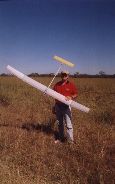 The Queensland State F1A titles attracted a reasonable turn-out of 9 competitors. The day was fine, with good lift, even if a bit breezy at the outset. This breeze got steadily worse, resulting in some rather long retrieves. From my stable of new, hi-tech F1A's, I decided on the light-weight "Sija" for the first (8AM) round and was rewarded with a max (and a long retrieve). Rather than change horses, I stayed with the Sija (pictured here) and ended the day with 180, 180, 180, 91, 180. All in all, I tromped over 10 km through chest high grass, passing over, through, or under 40+ barbed-wire fences, which proved good enough on the day for first place! The model employs a tubular carbon-fiber spar, carbon TE, balse LE, with carbon caps tieing the whole thing together. It is fitted with circle tow and zoom, but due to wind strength (and very high grass in the running area), I straight towed all day. Ultimately, I believe it was light weight that helped me most. The model actually carries 45gm on the CG to get it up to just over minimum class weight. In the air it was obvious that at max surface area and minimum weight, I was just plain outfloating everyone. Thanks go to W-Hobby for a good kit of a good model.