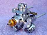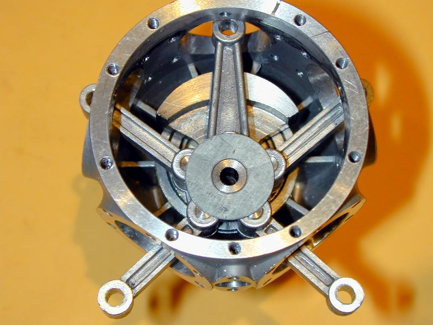 A far more serious implementation of this approach appeared in the 80's from the Japanese company G-Mark. Their five cylinder .30 cuin radial used gears and complex die castings. As seen in the photograph of a photograph here, each cylinder was fitted with an exhaust collector ring that vented forward into the gear housing, allowing the unburnt oil to provide lubrication. The MAN engine review [1] by Peter Chinn found the engine to be remarkably quiet, although an electric starter was required and it had a voracious appetite for glow-plugs; the latter hardly attributable to the configuration though.