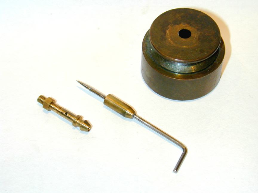 The making of a replacement needle valve and spray-bar was covered in detail as the Tech-Tip for November 2004. This resulted in a bright and shiny (shite and briney?) replacement which just looked plain *wrong*, and was likely to go on looking wrong for the next four or five years. So with nothing but the purest of intentions, the collective wisdom of the Motor Boys was canvassed to see if an accelerated way of aging of brass was known. Although it's perhaps difficult to see in the before (needle screwed to spraybar, left) and after (needle and spraybar separate, right) shots here, the results are actually quite acceptable and the NVA has just enough "age" patina on it to not look totally out of place any more.