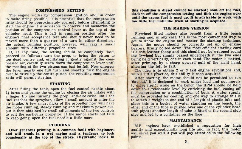 The engine pictured above is, quite obviously, one of the marine versions, M.E. having released both types simultaneously for both of their engines. In 1960, the standard version was priced at 47/3 (UKP 2.36 in today's money); the marine version was significantly more expensive at 64/11 (UKP 3.25). Ron Warring's review in the October 1960 issue of Model Maker [3] began by saying ...an extremely well designed and well made power unit with most pleasant handling characteristics--virtually the ideal answer, in fact, to anyone who regards the small marine diesel as "fussy". He also notes that the marine version dispenses with the rear mounted fuel tank and die cast prop driver, the 1-1/4" flywheel being mounted directly on the crankshaft taper.
