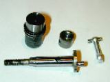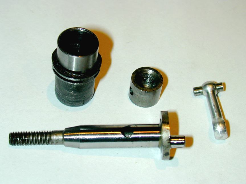 As received, the engine was missing the NVA (naturally!), and was fitted with a most unusual compression screw. A bit of gunge, some spot corrosion on the aluminium case, the lack of compression (via the cracked liner), and a slightly bent conrod testify to its past life as a marine thumper--one can inflict far more damage with two hands, a flywheel and a pull-cord than you can with a prop and a finger. The cap-head screw poking out of the cylinder head should have been 2BA, but turned out to be a 10-32. This substitution one can get away with, almost. The major diameter for a 10-32 is 0.190" and the pitch, obviously, is 0.031" (the inverse of 32). A 2BA screw, being metric, would be 4.7 mm, or 0.185" major diameter, and 0.029" pitch (31.4 TPI). So with a little persuasion, the two can be mated, though the softer one will never be the same afterwards. In this case the softer one was the head, so the replacement comp screw was made with the 2BA die opened up as far as possible in a vain attempt to achieve a good fit.