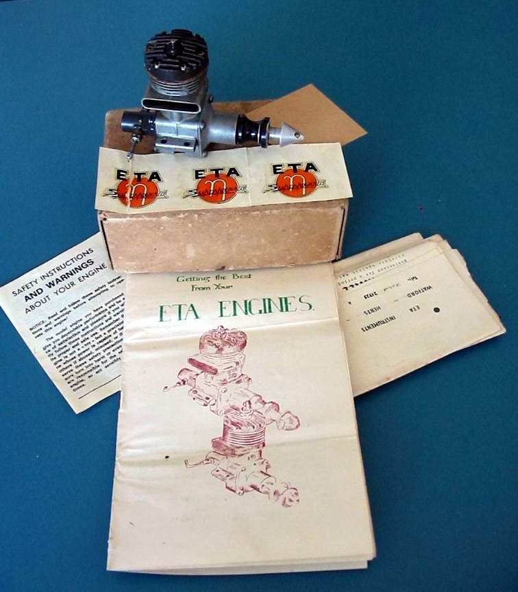 When introduced, the Mk I ETA 29 was quoted as delivering 0.54 bhp @ 14000 rpm. This performance continually improved with the 6/6C producing 0.82 bhp @ 17000 rpm. In England and Australia, this was THE engine to have in your "B" Class Team Racer.Van's engine has been run and flown in a control-liner (a Mike Ware "Carioca" published in the Dec/Jan 1957 issue of Australian Model News) but is original in all respects and he has respected to this very day the strong warning stamped by an unknown hand inside the box top that bears the designer's signature. Now, a quiz: there was an cuckoo in the nest when Van took the box contents photo, and one piece of the documentation is not from Eta Instruments. For 1 point, which piece is it? For an extra 4 points, who is it from? NB that 5 points and $3.40 will buy you a cup of coffee. Hover here for the answer.