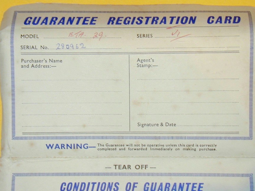 Alltogether, six "Marks" of ETA 29 were produced, although as we shall see, the Mk 6 underwent a significant revision to the "6c" that could be considered a seventh version. The "Mark" was not recorded on the engine, so telling them apart requires some extra knowledge. First indicator is the serial number [1][2]:| Mark | Serial Number |
