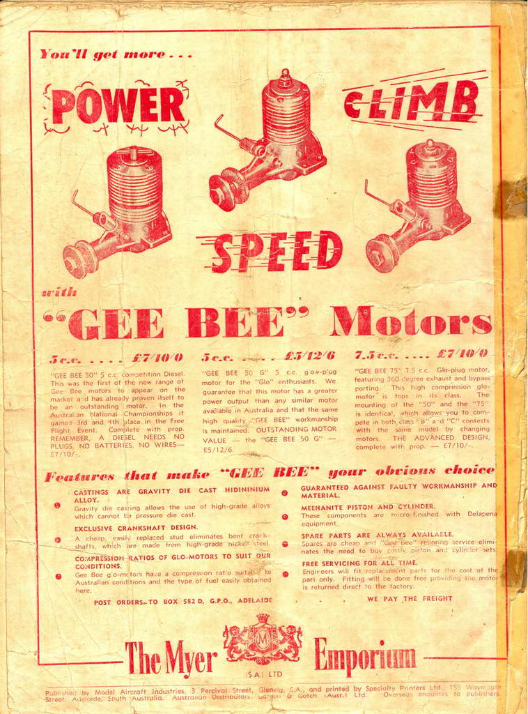 Gordon Burford is Australia's most well known and prolific engine designer and builder. The engine pictured here is one of his first mass produced engines. Chronologically, it fits between the "Drone" (aka GB Stuntmota) style engines and the first Sabre. Appearance wise, it bears features of the English Yulon series in the "beehive" shape of the head and finning above and below the exhaust ports. However, the Yulons (29, 30 and 49) all used "updraft" intakes and nearly all had a series of small diameter holes for the exhaust. The GB50 has more conventional down-draft intake and slotted exhaust. The liner is secured to the case with four short round head screws (look closely in the exhaust band). The head is then secured with four long screws spaced between the short ones. The backplate has two holes in its rim to accommodate a "pin" spanner, unlike Gordon's later engines which used the more conventional "penny" slot arrangement. It's also worth noting that Gordon always referred to his early motors as "GB". The Gee Bee moniker came from the advertising of his somewhat unethical agent and resulted in the name change to Sabre, but that's another, longer, sadder story.