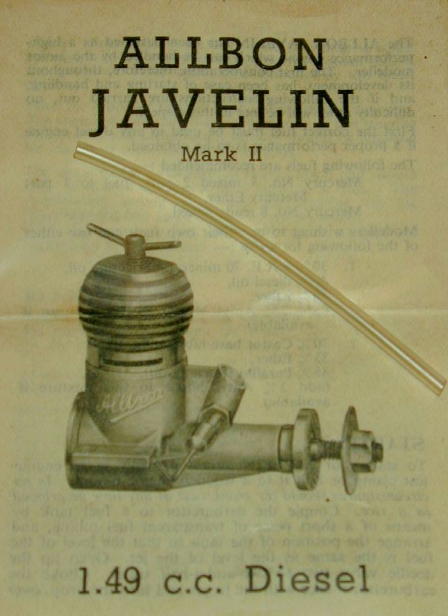 In 1949, Allbon Engineering released their comparatively short-lived 1.49cc Allbon Arrow glow motor. This was followed a couple of months later by the more successful Allbon Javelin, a diesel of the same capacity that utilized the same crankcase. Over the next three years, the range grew with first the 1cc Allbon Spitfire, then the 0.5cc Dart. Judged by the number of plans appearing in Aeromodeller showing one or the other of the engines, the range was well received, with the Dart being especially suited to small free flight scale designs popular at the time (and much sought after for the same purpose today). In 1953, Allbon Engineering merged with Davies Charlton and production moved to the Isle of Mann as already chronicled in the Manxman story. Both Javelin and Dart went through one major design change in late 1952. The revised engines were called "Mk2" although the exterior changes were small. The Javelin Mk2 was, I believe, the inspiration for a number of other engines from other designers in the UK and abroad. Today the engine is comparatively rare, probably due to its very light construction which must have seen literally thousands consigned to the tip due to damage and wear. My example, seen here, is a rare New-In-Box Mk2, circa mid 50's probably (no Allbon's carry serial numbers), and so, alas, too damn valuable to run (grrrr).