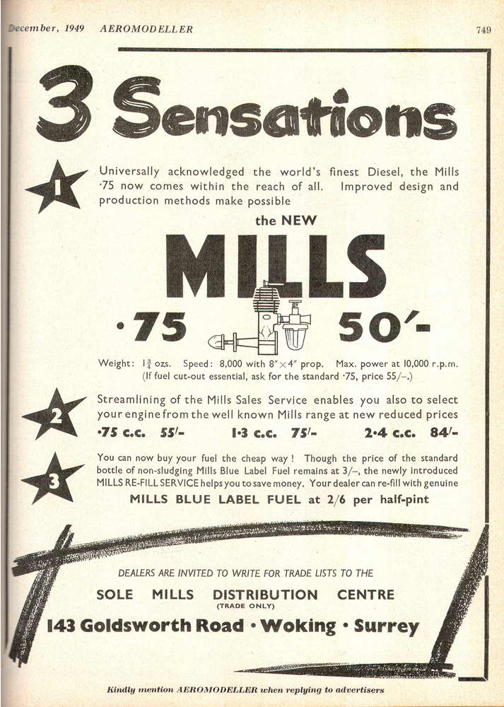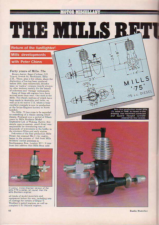Many reviewers have nominated the Mills .75 as the greatest and most popular, all round sport engine to come out of England of all time. Based on it's reliability, together with its simplicity, performance, and ease of operation, I don't think I'd want to argue with that. Manufactured by Mills Brothers (Model Engineers) Limited of Woking, the "point seven-five" and larger, but short lived Mk III 2.4 both appeared in 1948, about two years after the release of the highly popular Mills 1.3 Mk I. A year later, Mills revised construction (presumably, shifting to a cast crankcase [1]) and introduced a second model at a slightly lower price.