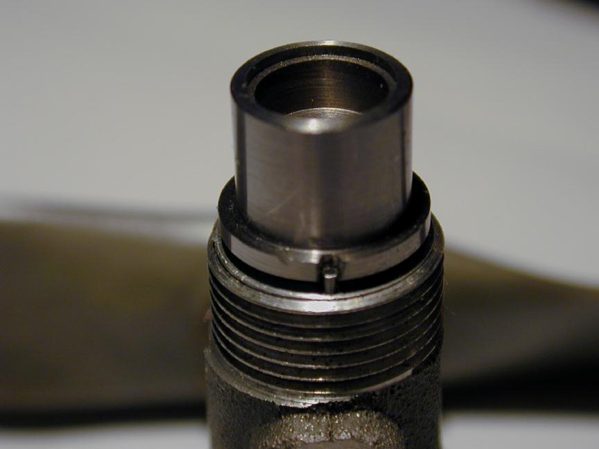 Well worth noting is the extreme danger presented by the cylinder liner rotating as the head is tightened down. The 1/8" diameter conrod is swinging in two 5/32" slots milled in the skirt of the liner. Unless the liner is a tight press fit in the case, it is apt to rotate a bit on assembly as the head is screwed down. If this happens, the rod will rub in the slots. Bad for the rod and bad for power loss. Worse, if it moves under vibration, the engine can jam solid with painful results (ask me who has had that happen to them...) The Doonside Mills solved this problem by inserting a small pin into the case that registers with a slot in the liner flange. This assures correct alignment and permits the head to be tightened with no fears. Again, the Classic plans will show this modification. The photo shows the pin fitted to my own prototype Classic kit built engine, regrettably after having disaster scenario #2 occur. This is a bullet proof mod that is easy to do with a Dremel cut-off wheel to cut the slot. After setting the alignment, the slot itself is used as a guide for a #68 drill. To complete the modification, a short pin made from 1/32" piano wire is then pressed into the hole so its top is just below the top of the liner flange.