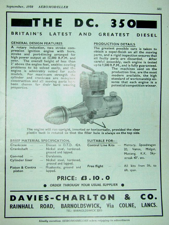 The earlier DC "350", reviewed in Aeromodeller by LH Sparey in November 1950 and January 1952, used a mono-block case with cast-in fins and a head secured initially by 3, later 6, screws (after heads were observed to explosively and embarassingly depart from the case while running). The Manxman adopts the simpler, lighter and more robust design with separate cooling jacket and 4 bolts. Aeromodeller reports that the main crankcase journal size had also been increased--this being another noted weak-point of the "350". The Aeromodeller test figures for the Manxman stated RPM in the range 8000 to 14000 (the latter using a 7x5 prop--stand back and mind your fingers on a cold winter's morning!). The report observed that it was not possible to stop the engine by backing off the compression screw, right thru the RPM range. The comp screw is also rather short, perhaps to prevent it being over compressed (whether by the screw bottoming on the head top, or the operator burning his fingers on the head is uncertain). Although the DC 350 was most certainly designed by Hefin Davies, I'm tempted to credit the Manxman design (or redesign) to Alan Allbon as it bears more of his style. Incidentally, no-one seems to know who "Charlton" was, or if he even existed. Perhaps it was like the "Ashton" of early database vendor "Ashton-Tate"--a name made up to make it all sound grand (although George Tate did eventually buy a parrot and name it Ashton--but I digress...)