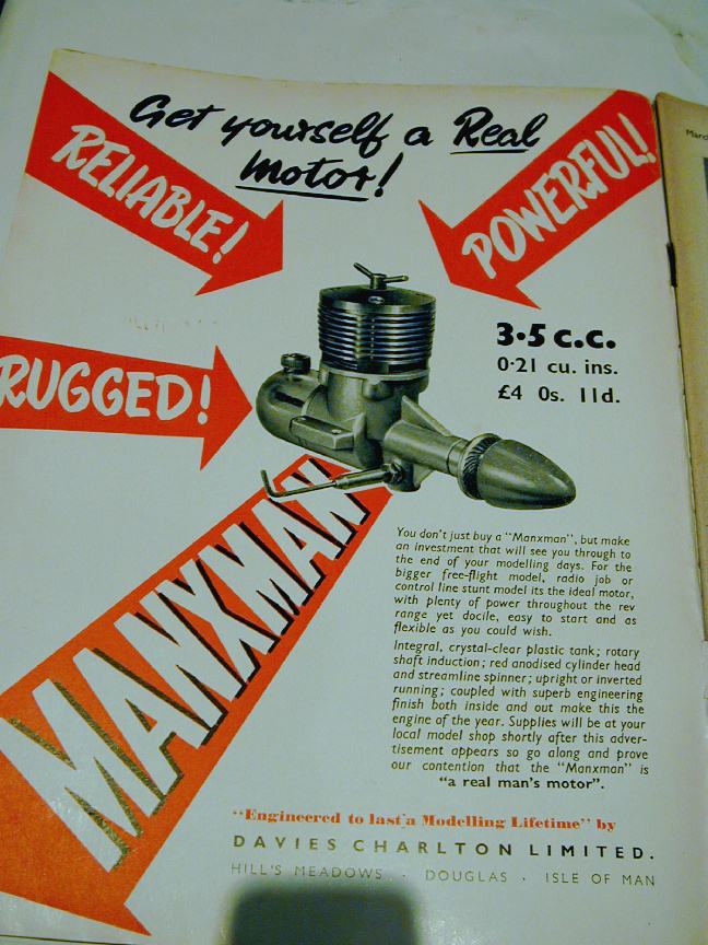The first add I was able to locate for the Manxman was a full-page, two color, inside front cover placement in Aeromodeller of March 1956--the usual location for DC adds. The same add was repeated in different colors in April and May. In June, DC changed to a new montage of their engine range, now including the new Merlin, Super Merlin, and Manxman. The same full-page add appeared in Model Aircraft magazine of April and May. Note the line saying "Supplies will be at your model shop shortly..." Normally, Aeromodeller and Model Aircraft would review new engines as they were first released. Eleven months passed from first add to Aeromodeller "Engine Analysis No 30" mentioned above. This may indicate that supplies were slower arriving than anticipated. I've searched Model Aircraft through to the end of 1957 and find no review for the engine. Terry McDonald's Index of Engine Reviews doesn't show a MA review date either, so we'll conclude that none exists.
