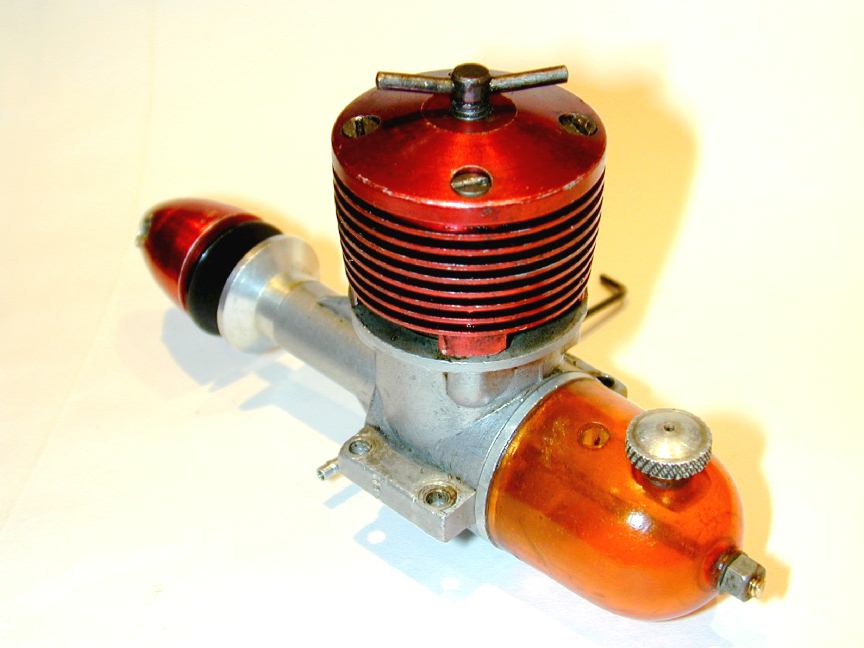 I'm uncertain regarding the color of the tank on my example. It is distinctly orange, though I don't know if this is original, a result of age, or a result of some strange fuel additive (DCO suggested someone had dumped "Redex" in the mix, but he's prone to the occasional leg-pull). Construction is quite conventional: Steel liner, cast iron conical-top pistons, plain bearing, 360 degree porting with a small but noticable amount of sub-piston induction at TDC. Although die-cast, the case is rough enough to be sand cast. This is odd as all other DC engines had quite elegant die-cast cases with fine, intricate, embossed lettering. These features are totally absent on the Manxman. At 6.5 onces, it's sure no light-weight, but most find it attractive and purposful looking.