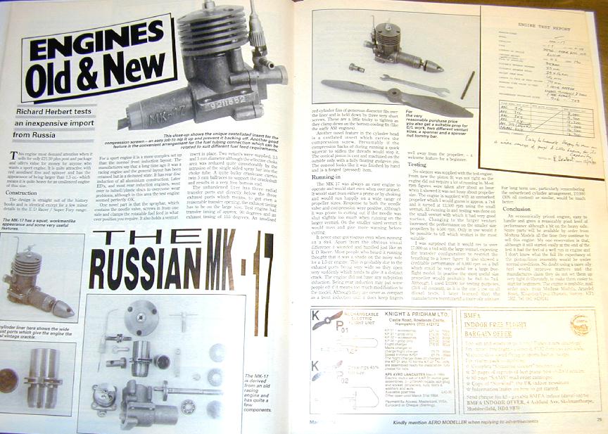 The first hit comes from Peter Chinn's column in the February 1976 issue [2]. Here Peter notes that the Mk 17 is a development of the Mk 16K, and that the latter was designed by one V Petukov, "..as long ago..." as 1956 (so Mr Herbert was quite correct in this impressions). The differences noted by Chinn from this earlier engine include beefing-up of case casting, cylinder liner, cooling fin muff, and the removal of three circumfrential oil grooves previously turned in the piston skirt, two above and one below the wrist pin. He also notes that the 16K was first imported into the UK in 1973. He states that the claimed power output from the Mk 17 was 0.14 bhp at 14,000 rpm.