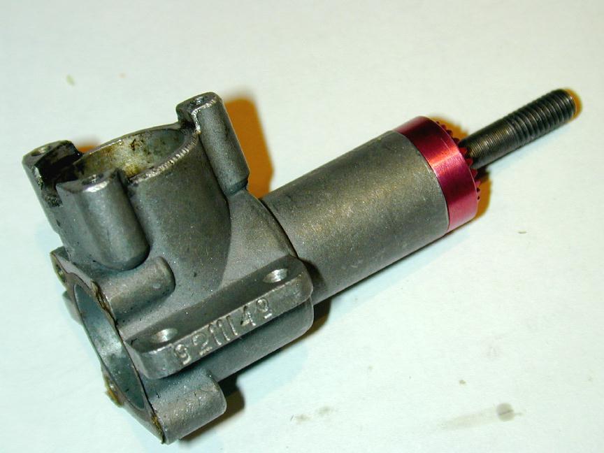 Completing the back-end of the engine, we have the slightly unconventional needle valve assembly. This comprises a piece of hex steel, turned down on either end and threaded. One end carries the needle valve; the other screws into the backplate casting. When tightened up, it protrudes roughly half way into the inlet and locks down the needle ratchet clicker and the fuel banjo, as well as holding the venturi insert in place. The banjo fitting is a nice touch, normally confined to more expensive engines. But closer examination shows some cost savings that are either crude, or smart, depending on your philosophical point of view. The spray bar is drilled through diameterically, not for fuel delivery but for fuel pick-up. Delivery is from a fine jet in the end. The needle seats neatly on the small, just protruding slightly when fully closed. The hole in the banjo is is 4.3mm; the OD of the spray bar at the jet holes is 2.4mm. So we have a lot of slack. Two thin aluminium washers placed on either side of the banjo form a fuel collection cavity in the area where the spray-bar holes reside. Although it's most unlikely that spray-bar will be centered in this cavity, with two jet holes, there is no way to tighten everything up that won't feed fuel--though some will be better than others. The needle is a bit massive. Hell, the whole thing is a bit massive, but it's innovative and functional. Overall, I gotta say I like it.