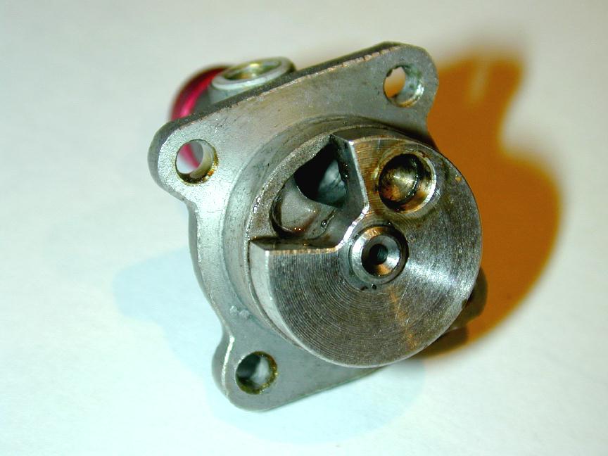 The backplate is relatively conventional with an aluminium timing rotor, held captive under a steel retainer. This retainer is secured by an external screw as shown in the picture here. The inlet is positioned at 12 o'clock, requiring a channel to be provided, following in the direction of rotation, to extend the induction period. I discovered this trick while making the RRV AHC with inlet in the same location. It is not possible to totally govern the inlet duration with the cut-out in the rotor, as the required position would intersect the driving pin position. The relieved backplate trick side-steps that. Note that the backplate is fitted with an anodized venturi insert. The engine reviewed by Herbert was provided with two: 5.0mm, and 3.5mm. Alas, mine came only with the 5.0mm insert. You can also see more numbers stamped under the rotor pin screw. On my engine, this is "539" with the "3" about twice the height of the other two digits. With no evidence whatsoever, I'm going to assert this means the engine was assembled in the March run of 1959. Prove me wrong