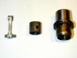 The piston appears to be cast iron. Not turned from cast iron, but actually cast, with little wrist pin pads and generously hollowed. As mentioned above, it has a conical top, and the contra-piston has a corresponding conical depression. The wrist pin is fully floating with rounded ends. The conrod appears to be forged aluminium, very, very crudely de-flashed on the sides, but with narrow oil slits cut into both ends--just like motors intended for high speed running. I read (in White's R2800 book) that forging aluminium can increase the material strength by up to 50%. This engine is just loaded with contradictions, or perhaps it's a case of care and vision on the part of the designer, let down by the assemblers. By the way, the example photographed here is new, "unrun", never mounted, no question. But it shows sighs of having had fuel in it, and there are feint wear marks where the floating wrist pin contacts the liner. I'd have to say this indicates factory running--in fact I had to use heat to free the piston up for disassembly. Another aspect that says "quality" despite the lack of same in other areas (and wait for the doozy at the end).