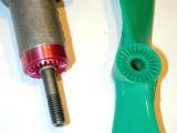I think one of the nicest features of the Mk 17 is the knurling on the prop drive washer, the corresponding spline molded into the prop, and the way spinner, prop, prop-driver and crankcase journal all neatly match and flow into one streamlined shape. The splines exactly match the knurling. This engine will flick over without sliping with the spinner nut only finger tight. And that knurling job! Normal practice is to plunge knurl by mashing a knurling wheel into the face of the driver disk. A moment's though will tell you that you are applying a speed gradient across the knurl wheel, effectively asking the knurl face on the outside to turn faster than the side on the inside of the driver. Guess what? It can't. So unless special tooling is used (like on Elf engines), the knurl has to slip a gear or two and the pattern produced gets trashed, to some varying degree. You can angle the knurl face to minimise this, but that shows, as does skipping. The Mk 17 knurl (pardon while I rave a bit more) is sodding-well perfect. The inside depth is the same as the outside. It's like it was cut as a little bevel gear, except with no bevel! I'll stop now and just say it's locked to the splindly crank shaft with a tapered collet.